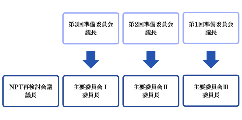 再検討会議に向けては、その3年前から1年に1回、準備委員会2が開催されます(下図)。これら3回の準備委員会3での議論を踏まえ、再検討会議が開催されるのです。全3回の準備委員会と再検討会議によって構成されるこの過程は「NPT再検討プロセス」と呼ばれています。